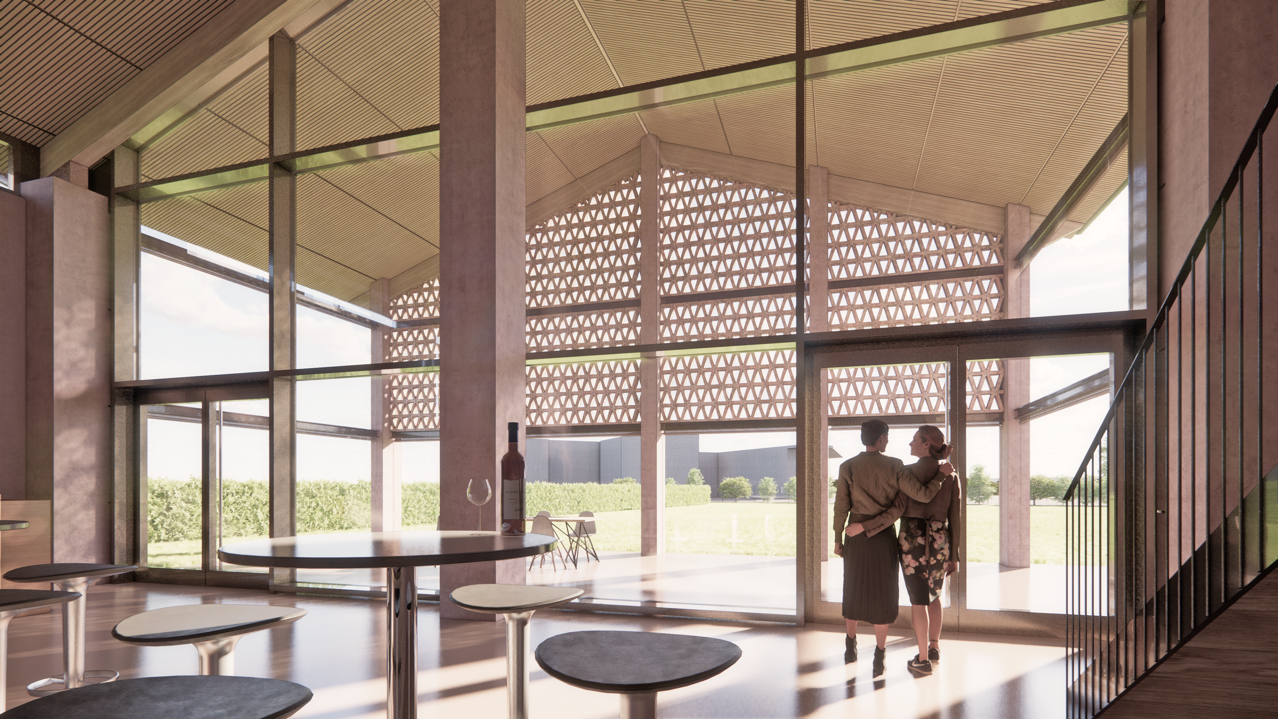 Lo studio tipologico dei fienili e degli annessi agricoli tipici della zona ha ispirato lo sviluppo di un volume con tetto a due falde dotato di un ampio portico sul fronte sud adibito a spazio di accoglienza per il pubblico con accesso al punto vendita e un altro portico analogo è stato proposto sul fronte nord in maniera simmetrica. Entrambi i portici, nella parte superiore del prospetto, sono schermati delle gelosie in mattoni, che costituiscono di fatto un frangisole nel fronte sud e un frangivento a nord.