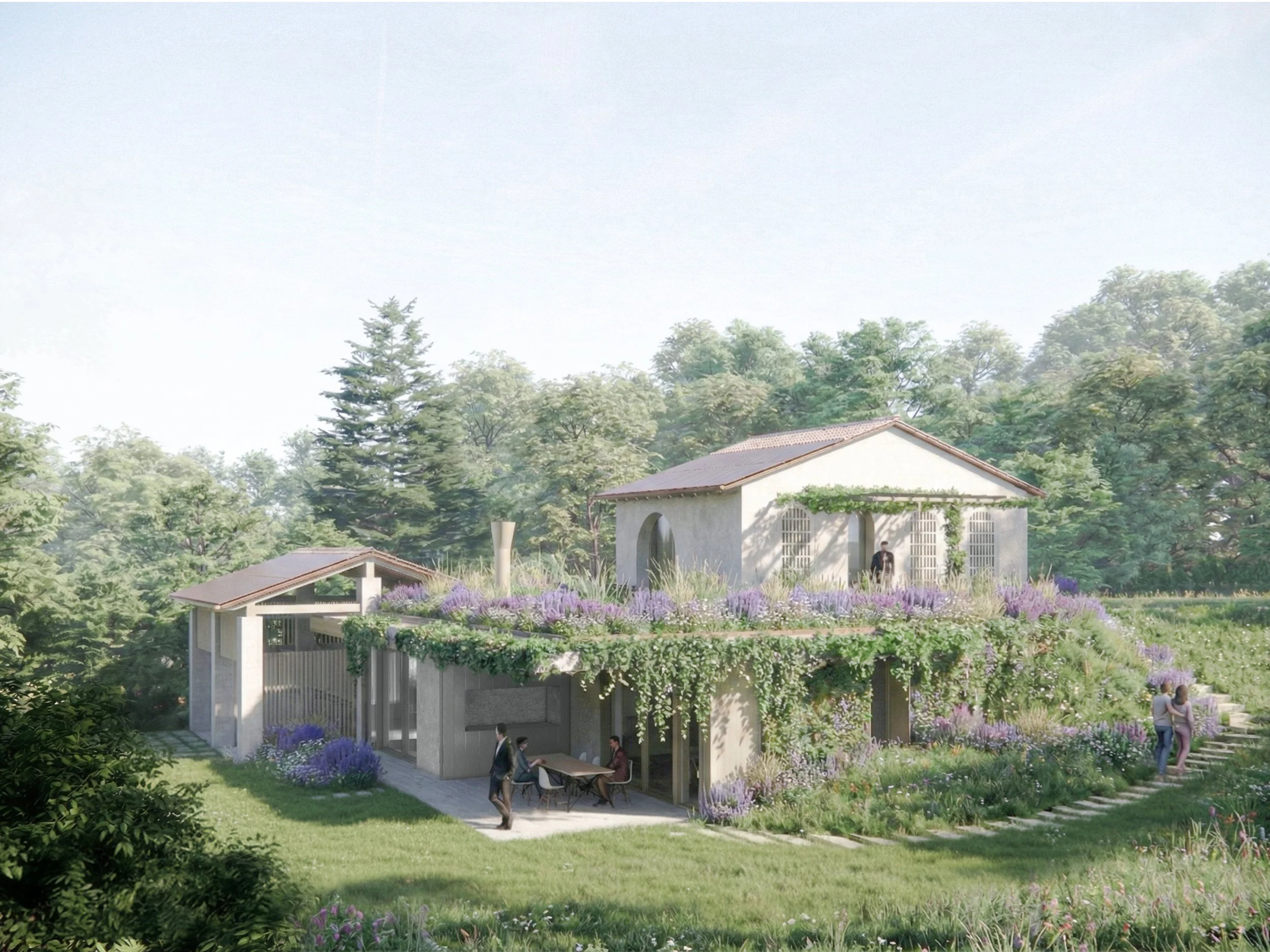 L’uso di intonaci a base di calce naturale e sabbia locale, strutture in legno, pompeiane inverdite e tetti verdi rafforza il legame con la tradizione costruttiva del luogo, mentre l’integrazione degli impianti fotovoltaici e l’attenzione agli aspetti energetici garantiscono elevate prestazioni ambientali. Il progetto interpreta l’abitare contemporaneo come equilibrio tra architettura, natura e qualità dello spazio esterno.