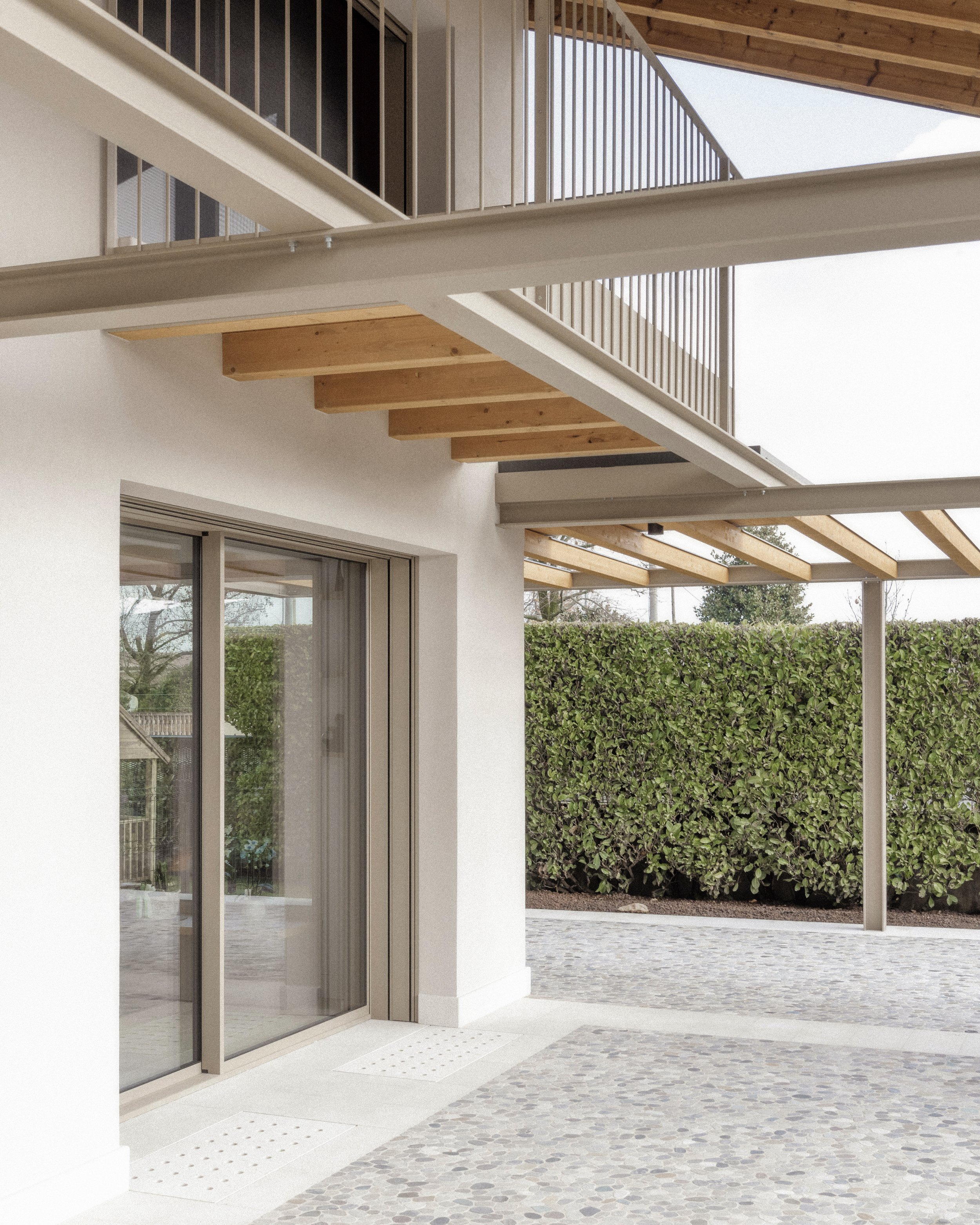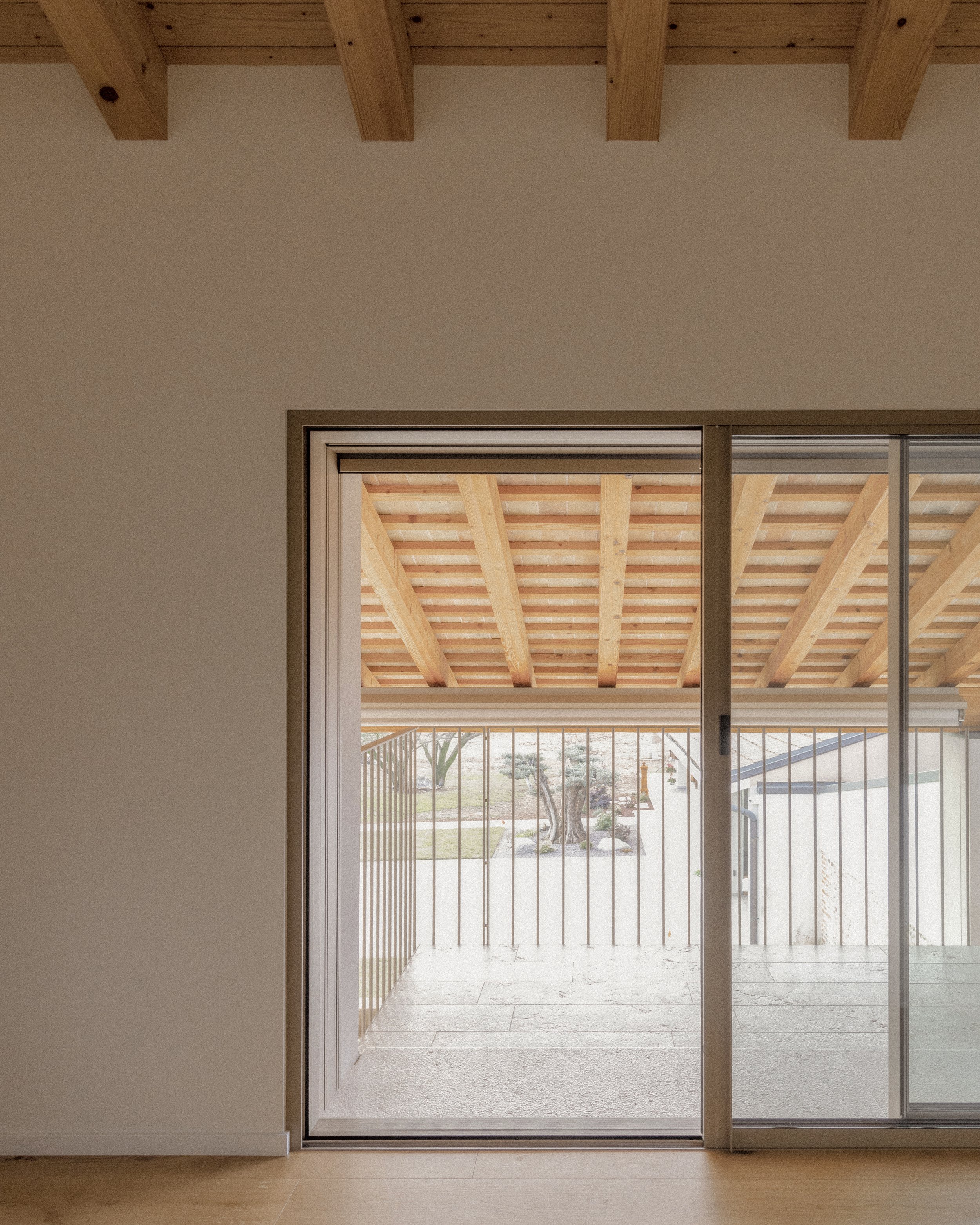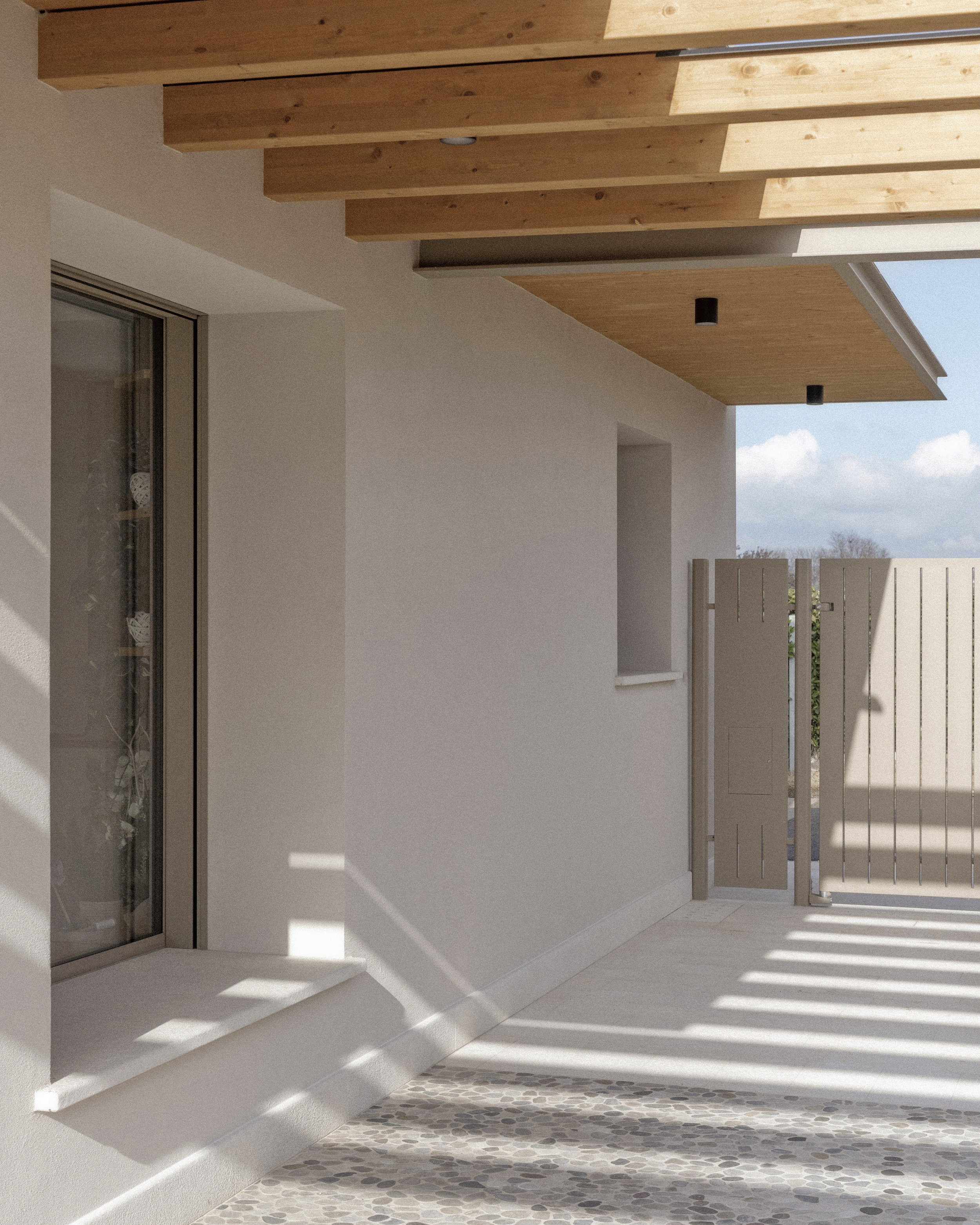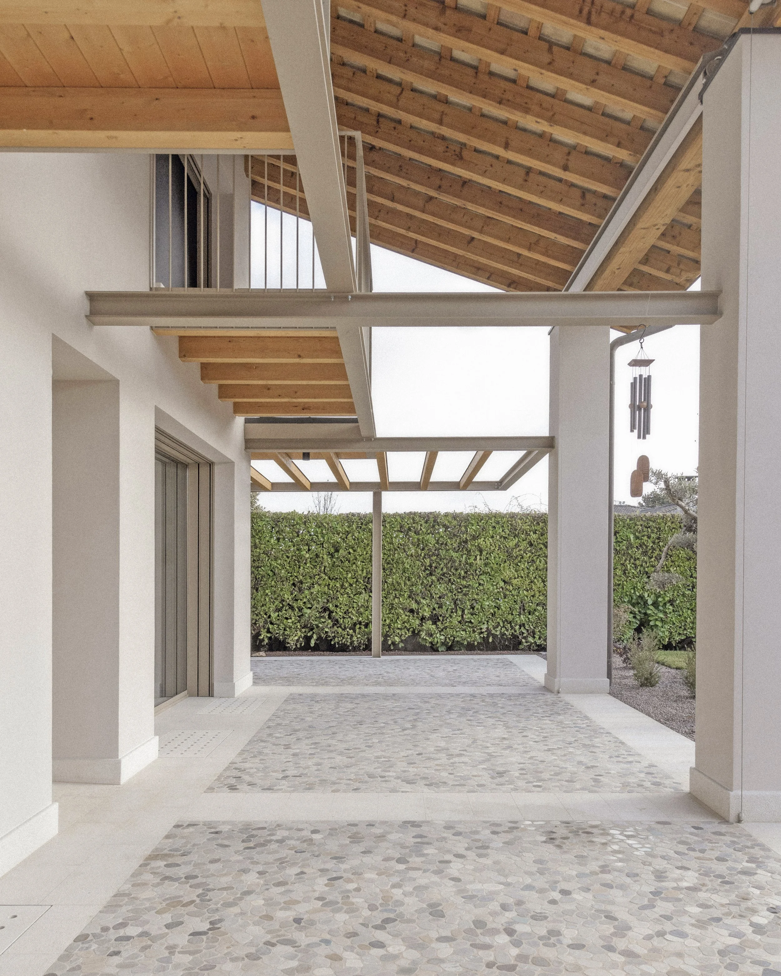 Il progetto si inserisce nella campagna di Montebelluna e riguarda l’ampliamento del garage della casa materna e il completamento della residenza della figlia, ancora allo stato di grezzo avanzato. Le due abitazioni, facenti parte della stessa proprietà, vengono così rilette all’interno di un unico intervento volto a dare nuova vita al complesso, creando un dialogo tra il carattere rustico delle preesistenze e le forme essenziali dei nuovi inserimenti. Per la prima struttura, l’intervento ha previsto l’ampliamento del garage, offrendo più posti auto, una zona deposito e una nuova area barbecue all’aperto, spazi pensati per essere condivisi e per portare maggiore comfort a entrambe le abitazioni. La seconda residenza, in fase di completamento, diventa il cuore di un progetto che pone attenzione alla luce e ai materiali come elementi centrali della composizione. Le piccole finestre preesistenti lasciano spazio ad ampie vetrate che aprono gli interni verso il paesaggio, enfatizzando il legame tra interno ed esterno. Questo rapporto si esprime in particolare al piano terra, dove il portico diventa un elemento di continuità visiva e fisica, consentendo al visitatore di percepire in modo graduale la fusione tra gli spazi. Anche i materiali concorrono a questo equilibrio, riprendendo la tradizione con un linguaggio contemporaneo che bilancia il carattere rustico della struttura originale con la pulizia dei nuovi interventi. Le pavimentazioni diventano elemento caratterizzante del progetto: al piano terra un pavimento in marmo gialletto d’Istria illumina la zona giorno e gli ambienti comuni, mentre al piano superiore il legno di rovere scalda e definisce l’intimità degli spazi notte. All’esterno, il portico riprende l’effetto rustico grazie alla pavimentazione in ciottoli, rafforzando la continuità visiva e materica tra le due abitazioni. Un intervento che riscrive il dialogo tra le due case, lasciando che la luce, i materiali e la natura facciano da filo conduttore.