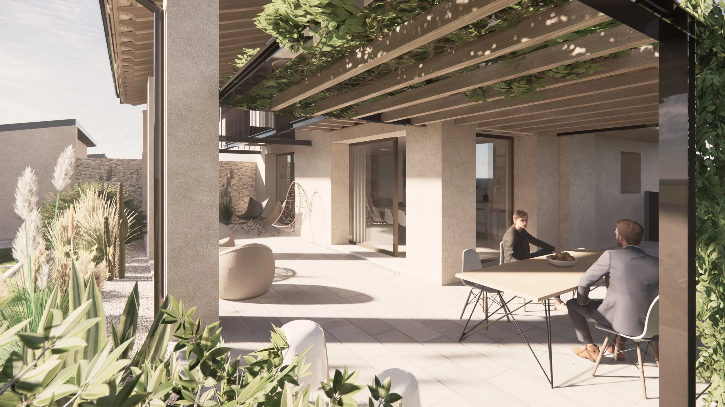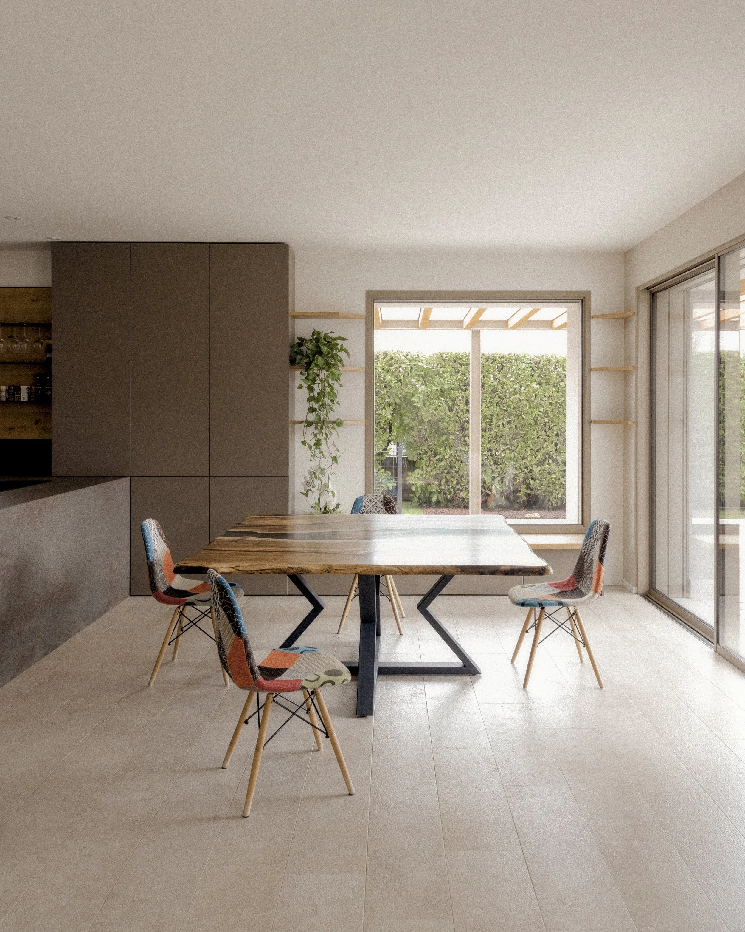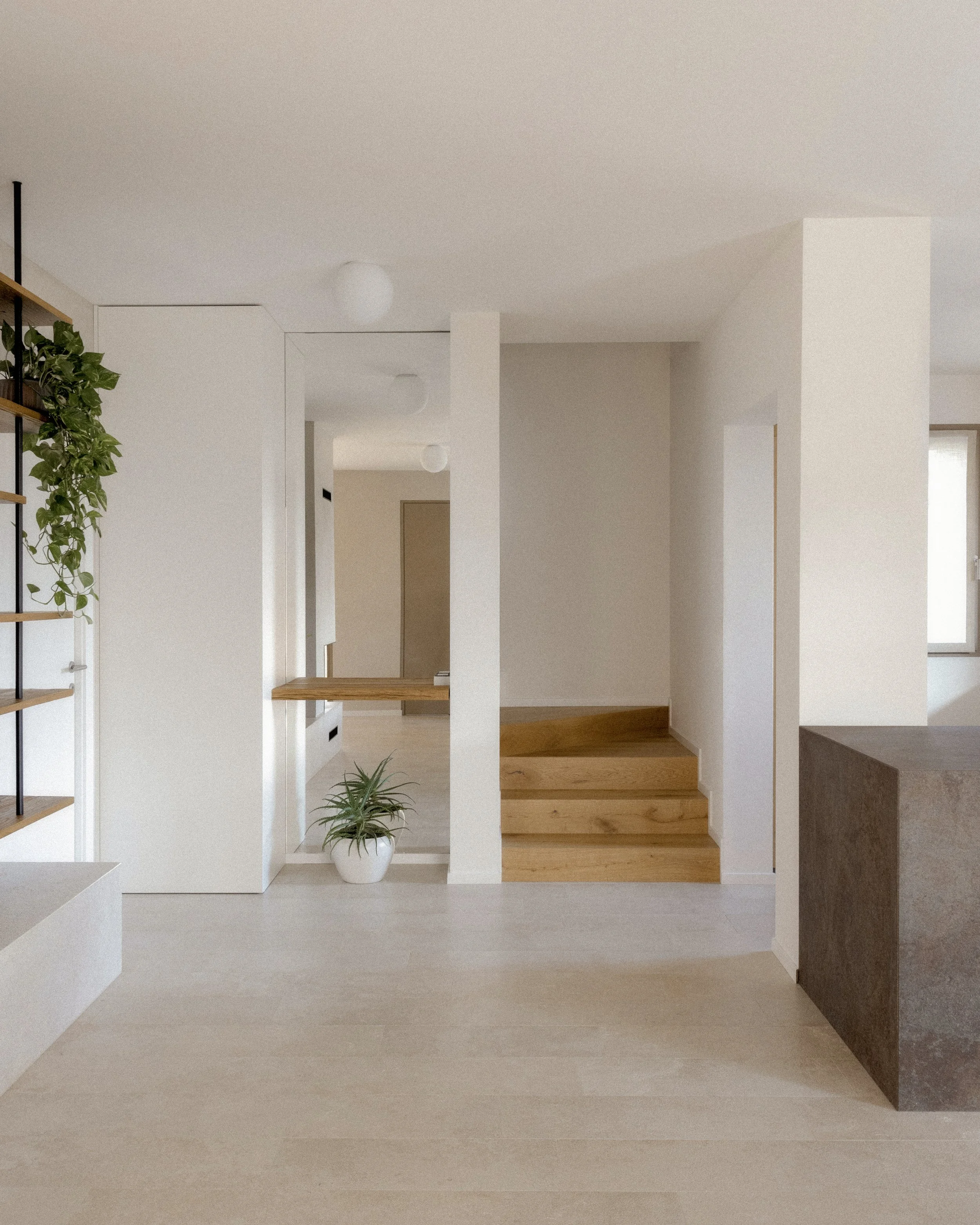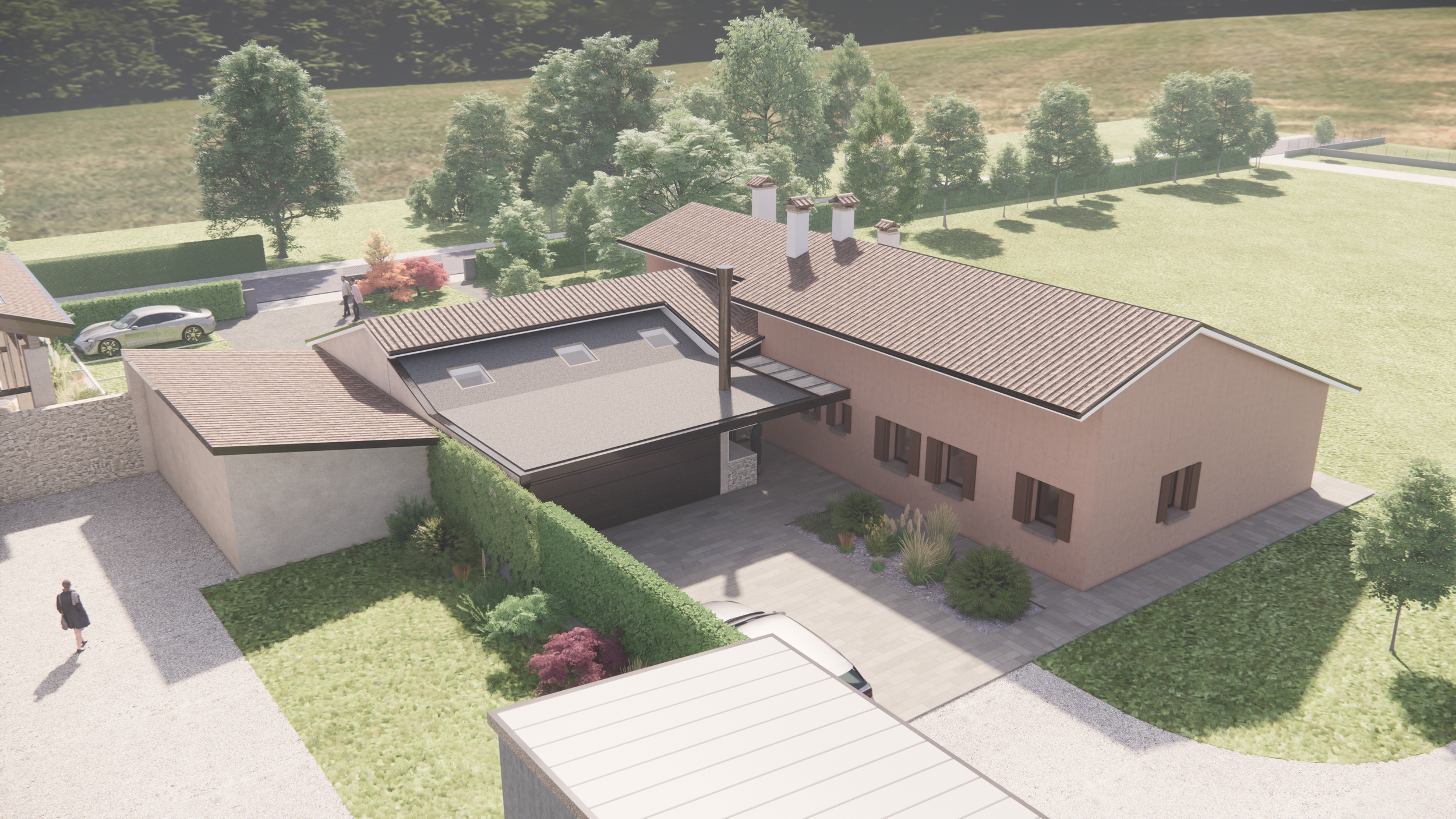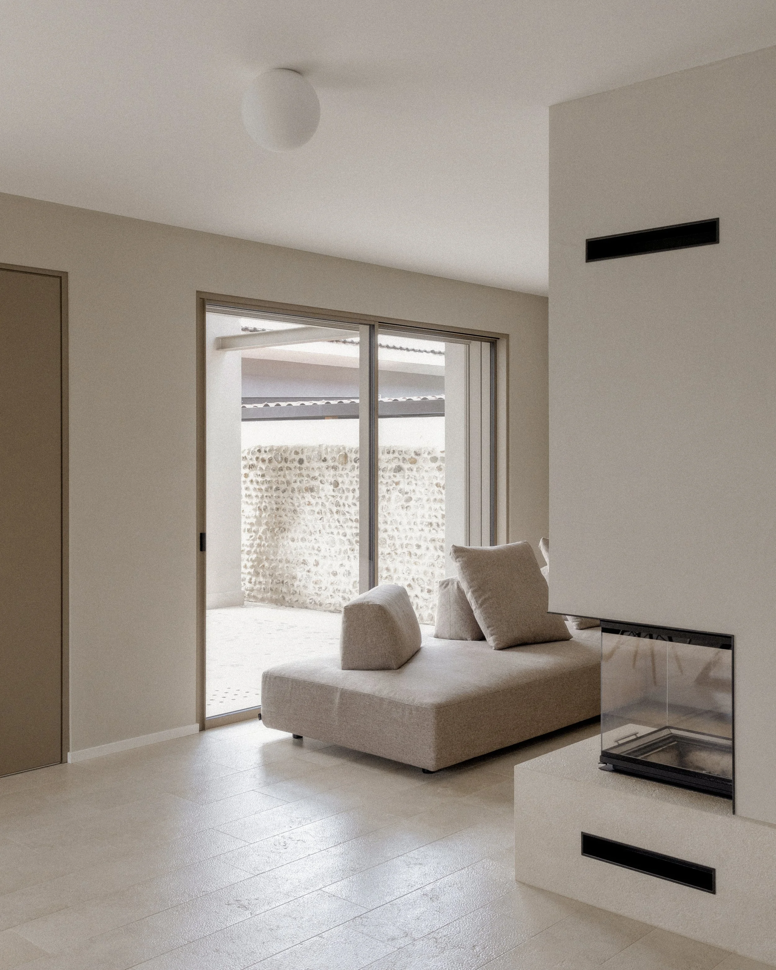 Il progetto si inserisce nella campagna di Montebelluna e riguarda l’ampliamento del garage della casa materna e il completamento della residenza della figlia, ancora allo stato di grezzo avanzato. Le due abitazioni, facenti parte della stessa proprietà, vengono così rilette all’interno di un unico intervento volto a dare nuova vita al complesso, creando un dialogo tra il carattere rustico delle preesistenze e le forme essenziali dei nuovi inserimenti. Per la prima struttura, l’intervento ha previsto l’ampliamento del garage, offrendo più posti auto, una zona deposito e una nuova area barbecue all’aperto, spazi pensati per essere condivisi e per portare maggiore comfort a entrambe le abitazioni. La seconda residenza, in fase di completamento, diventa il cuore di un progetto che pone attenzione alla luce e ai materiali come elementi centrali della composizione. Le piccole finestre preesistenti lasciano spazio ad ampie vetrate che aprono gli interni verso il paesaggio, enfatizzando il legame tra interno ed esterno. Questo rapporto si esprime in particolare al piano terra, dove il portico diventa un elemento di continuità visiva e fisica, consentendo al visitatore di percepire in modo graduale la fusione tra gli spazi. Anche i materiali concorrono a questo equilibrio, riprendendo la tradizione con un linguaggio contemporaneo che bilancia il carattere rustico della struttura originale con la pulizia dei nuovi interventi. Le pavimentazioni diventano elemento caratterizzante del progetto: al piano terra un pavimento in marmo gialletto d’Istria illumina la zona giorno e gli ambienti comuni, mentre al piano superiore il legno di rovere scalda e definisce l’intimità degli spazi notte. All’esterno, il portico riprende l’effetto rustico grazie alla pavimentazione in ciottoli, rafforzando la continuità visiva e materica tra le due abitazioni. Un intervento che riscrive il dialogo tra le due case, lasciando che la luce, i materiali e la natura facciano da filo conduttore.