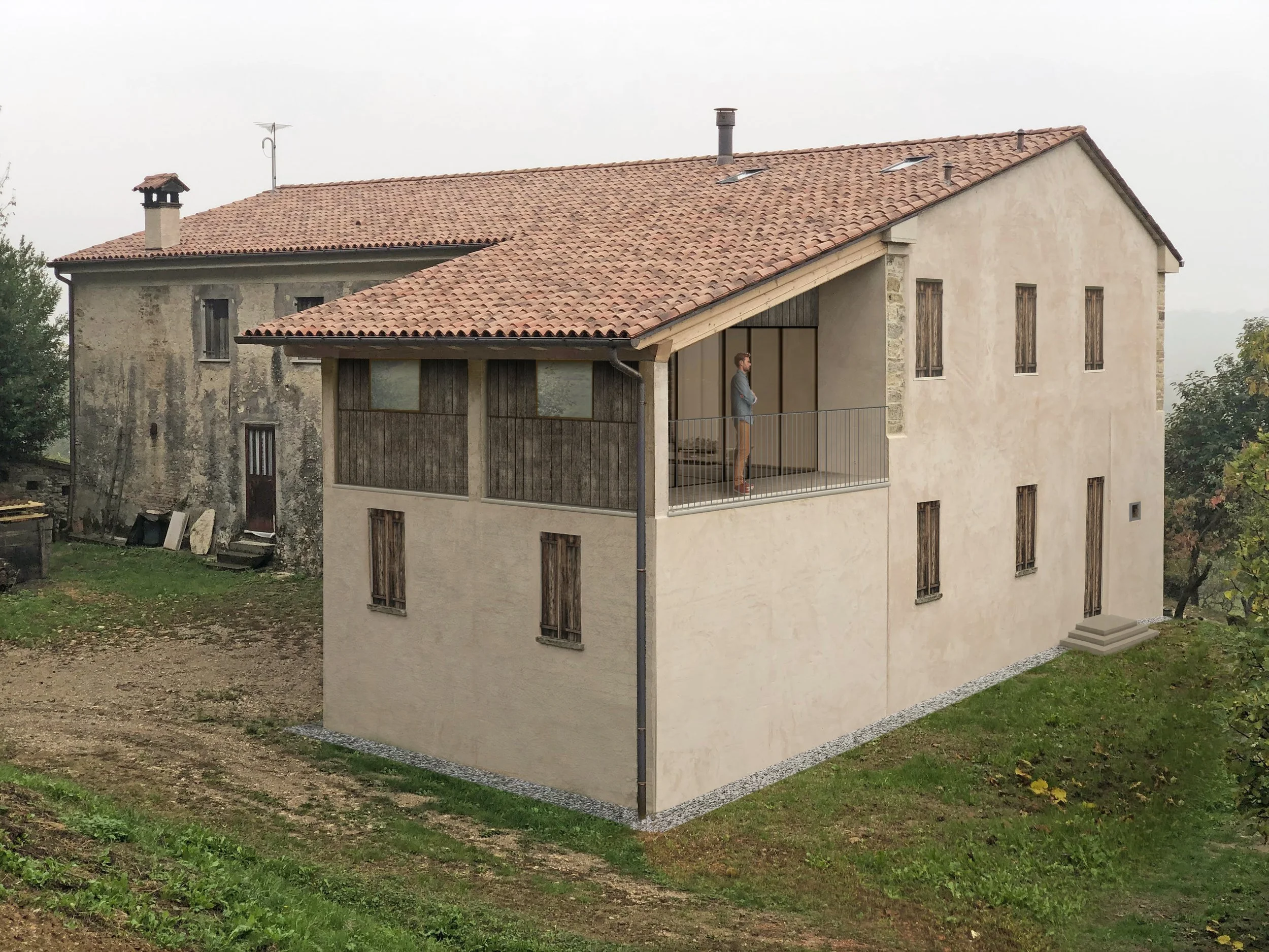 Inserito nel paesaggio collinare di Asolo, il progetto riguarda il recupero architettonico di una porzione di edificio rurale un tempo destinato a stalla e fienile, con l’obiettivo di trasformarlo in un’abitazione su due livelli, funzionale e perfettamente integrata nel contesto. L’intervento conserva l’impianto tipologico e i caratteri costruttivi originari, mantenendo intatto il linguaggio rustico dell’architettura esistente, nel rispetto delle peculiarità locali e della memoria storica del luogo. Il primo passo del progetto prevede la riqualificazione energetica dell’immobile: il rifacimento completo della copertura garantirà un adeguato isolamento termico, mentre l’aggiunta di contropareti interne lungo i muri perimetrali migliorerà l’efficienza energetica e consentirà l’integrazione degli impianti tecnologici senza intaccare l’aspetto estetico. La facciata nord verrà uniformata grazie alla replicazione delle aperture del piano terra anche al livello superiore, assicurando coerenza compositiva e simmetria visiva. Il sistema di accesso viene reinterpretato con attenzione, valorizzando le relazioni tra interno ed esterno. La nuova distribuzione interna prevede una zona giorno al piano terra, ampia e luminosa, collegata verticalmente da una scala di nuova costruzione che conduce al piano superiore, dove trova spazio la zona notte. Il piano primo ospiterà tre camere, tra cui una camera padronale con affaccio panoramico sulle colline circostanti, resa possibile dall’inserimento di una grande vetrata nella parete ovest, collocata in corrispondenza dell’apertura preesistente del vecchio fienile. I materiali e le finiture proposte, come intonaci a calce e serramenti in legno grezzo, sono pensati per dialogare in modo coerente con il tessuto storico e ambientale, valorizzando l’intervento senza alterarne la genuinità.