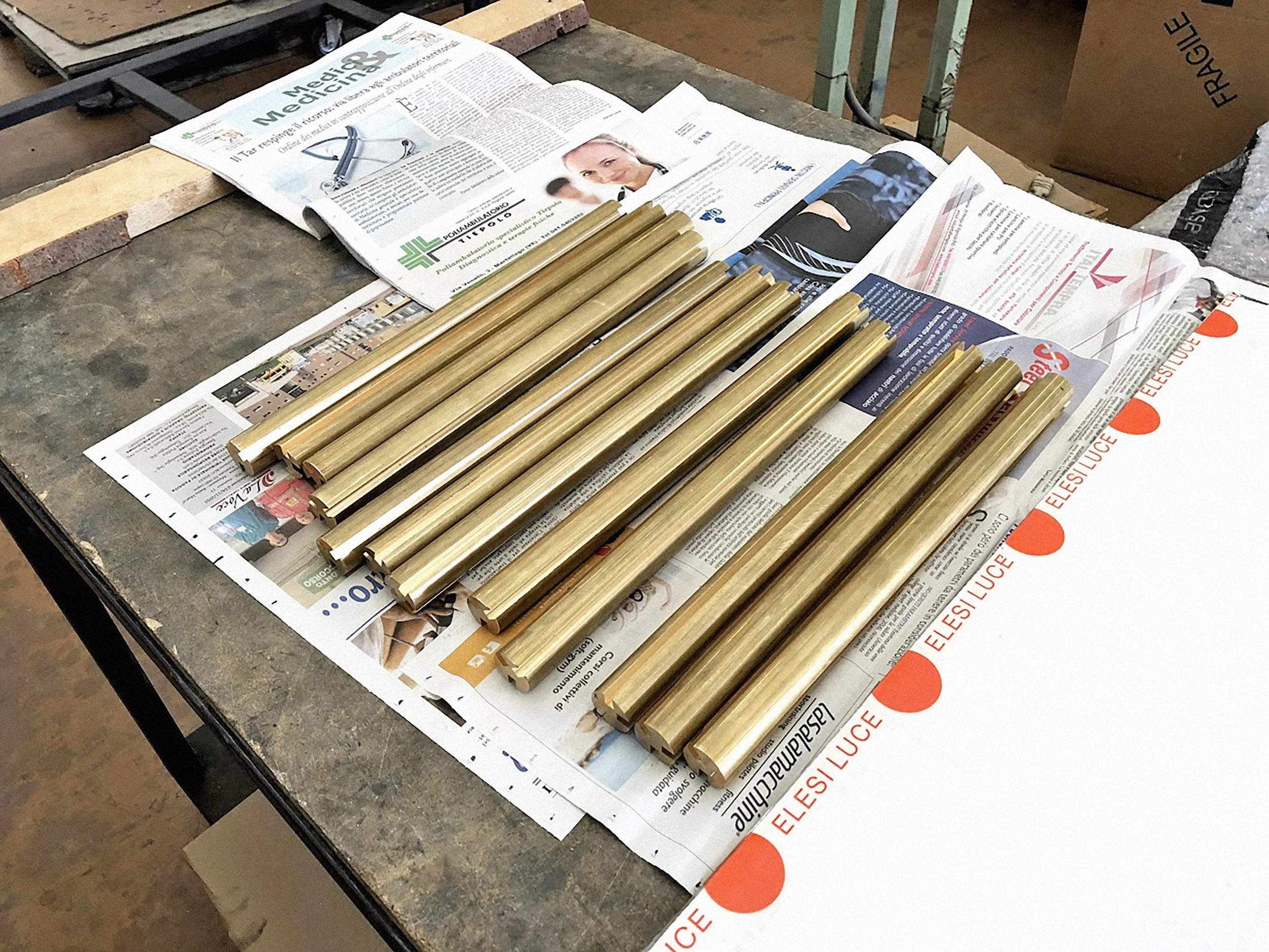 Libreria Spiga si compone di sottili lastre in ottone brunito che si dispongono su più livelli, intrecciandosi in una danza silenziosa per dare vita ad un mobile che si svela nella sua essenzialità. Ogni lastra e ogni ripiano accolgono precise fenditure a incastro, permettendo ai vari elementi di unirsi con naturalezza, senza saldature, lasciando che sia la gravità stessa a guidare e custodire la stabilità dell’insieme. Il cuore del progetto sono i cilindri in ottone, scavati con cura in tre punti, che accolgono le tre lastre principali disposte radialmente, trattenendole in un abbraccio discreto e garantendo coerenza all’intera composizione. Il peso del materiale diventa alleato, trasformando la forza di gravità in elemento costruttivo e poetico, custode silenzioso dell’equilibrio. Prima dell’assemblaggio, ogni elemento attraversa un processo di brunitura, lasciando che l’ossidazione avvolga l’ottone in una superficie opaca, che dona calore e profondità alla materia. Le dimensioni contenute e la leggerezza visiva le consentono di abitare gli spazi con discrezione, potendo essere utilizzata sia come libreria a giorno sia come elemento divisorio per ambienti. Libreria Spiga è un oggetto di design che invita all’osservazione attenta, alla scoperta del dettaglio, alla comprensione di un gesto costruttivo che si trasforma in poesia silenziosa per lo spazio.