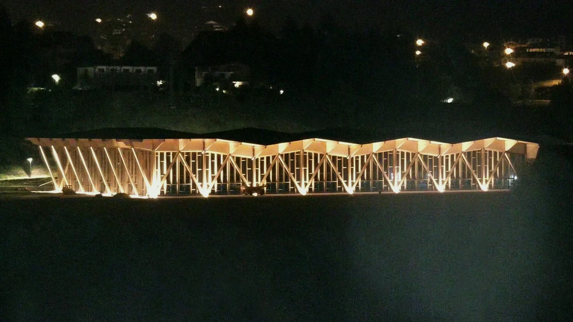 Collaudata l’illuminazione esterna della sala polivalente. La stuttura lignea viene messa in evidenza e valorizzata da un doppio sistema di fari a led che proiettano la luce dal basso sul lato ovest e dall’alto sul lato corto a nord.