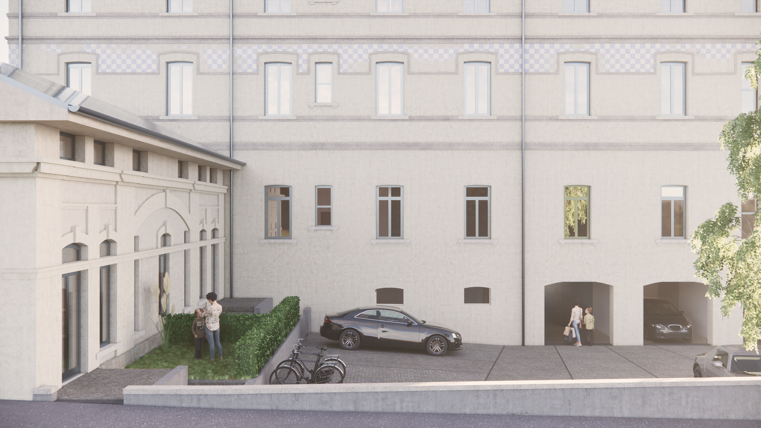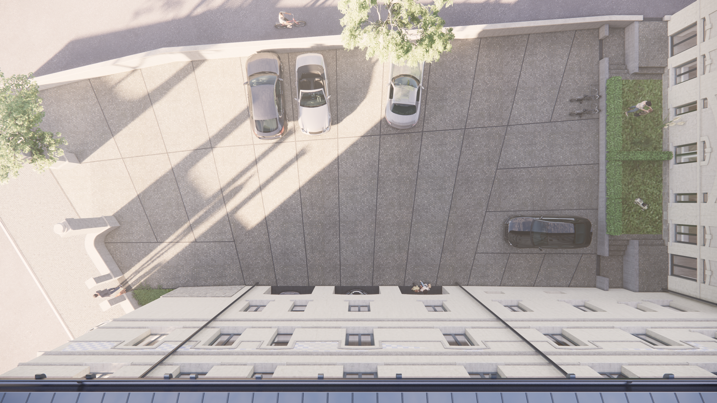 L’impianto distributivo interno è stato completamente riorganizzato mediante l’inserimento di un nuovo nucleo strutturale centrale, in grado di ospitare il vano scala, l’ascensore e di garantire un comportamento sismico adeguato. Questa soluzione ha permesso di ottimizzare gli spazi interni, sfruttare appieno le altezze dei piani e ricavare cinque appartamenti per livello, tutti orientati verso il paesaggio dolomitico. Il progetto prevede anche la realizzazione di nuovi solai ad alte prestazioni acustiche, la valorizzazione del piano attico con spazi abitabili e funzionali e il recupero del caratteristico vano scala circolare sul lato ovest convertendolo ad uso abitativo. Il piano seminterrato viene riconfigurato in continuità con il piazzale nord, destinato a parcheggi privati e ingressi secondari, integrando così l’edificio con il tessuto urbano e migliorandone l’accessibilità e la fruibilità complessiva.