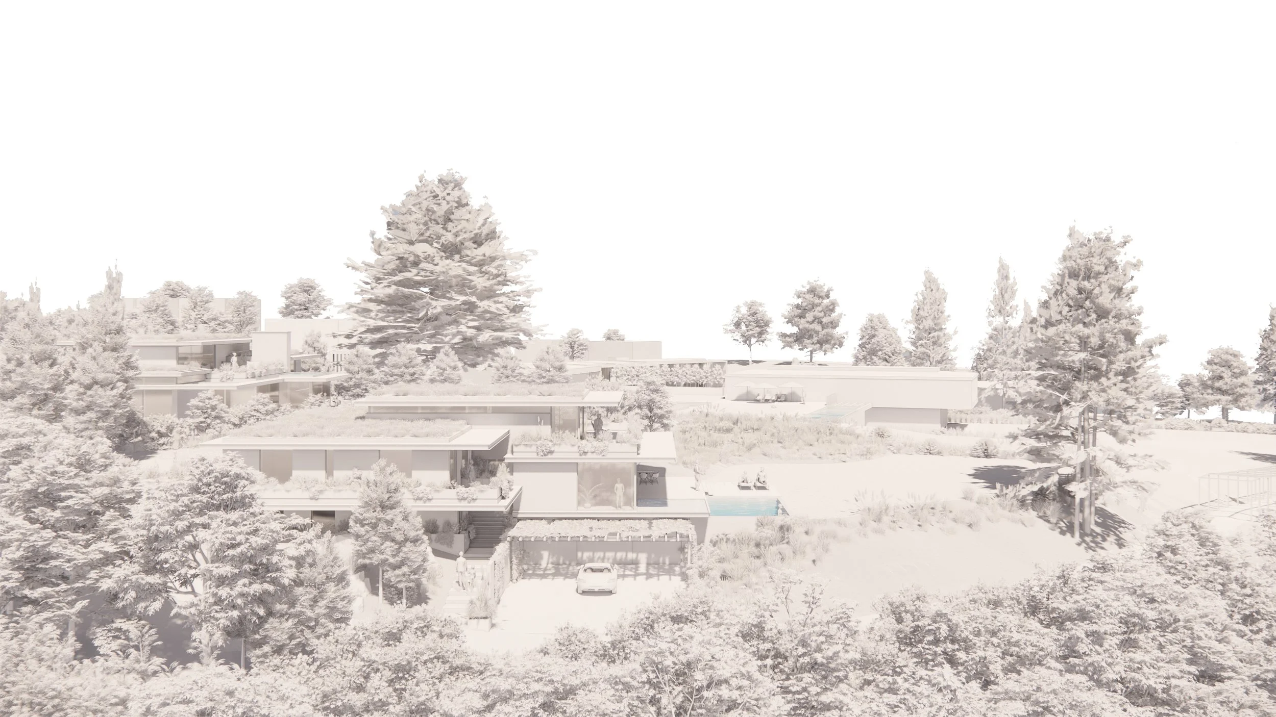 Gli spazi esterni, concepiti come estensione del vivere quotidiano, offrono a ciascuna unità aree verdi private su piani sfalsati, separate attraverso terrazze che garantiscono autonomia e intimità. Ogni villa dispone di una piscina esterna indipendente, protetta visivamente da vegetazione e modellazione del terreno circostante.